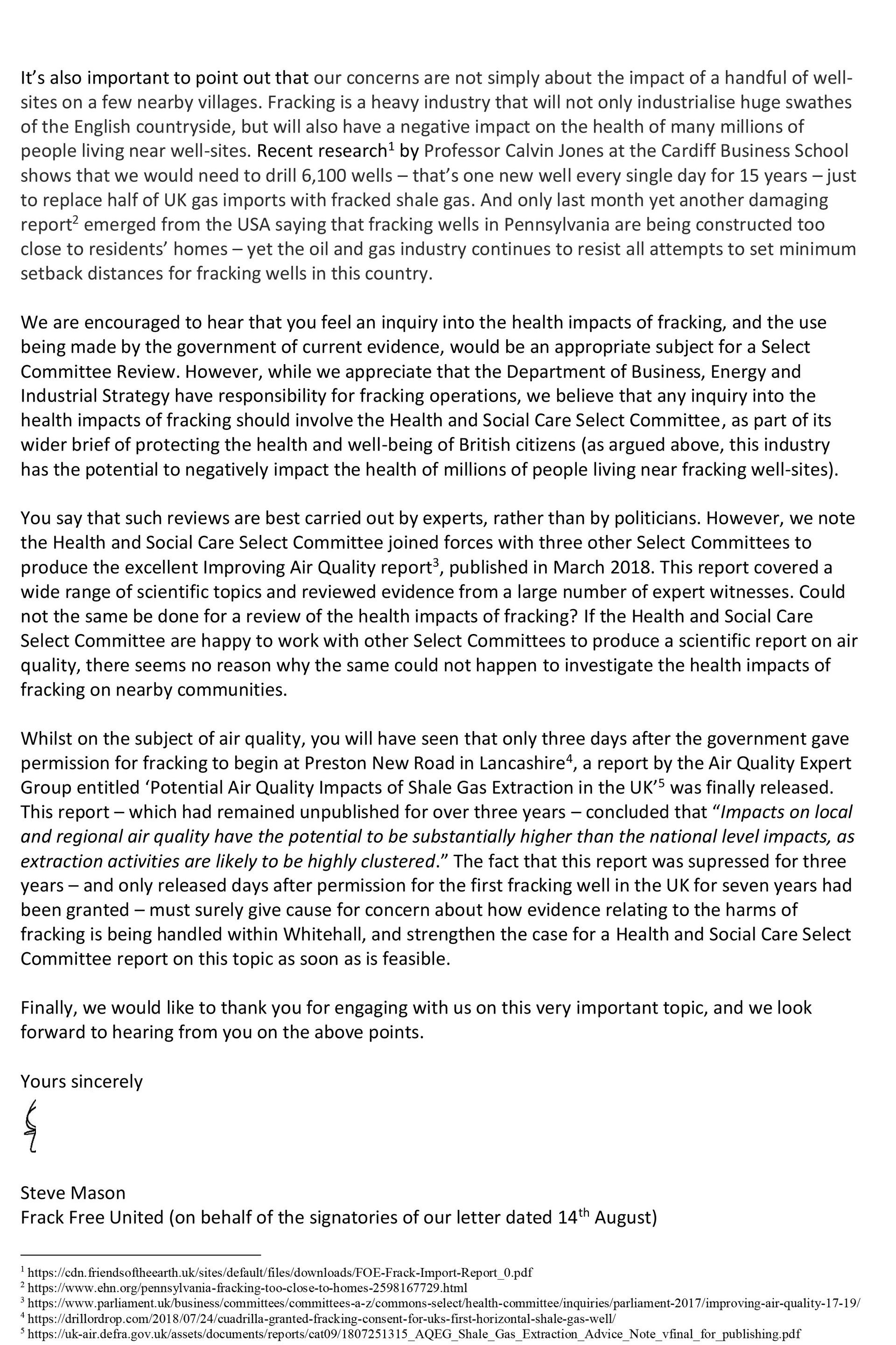We would respectfully suggest that it is the responsibility of the Health and Social Care Committee to scrutinise Public Health England’s hands-off approach to p and challenge the Secretary of State on the fact that the PHE report has not kept pace with the growing body of research on the health impacts of fracking. We would therefore be grateful if you could ask Mr Hancock the following questions on our behalf.