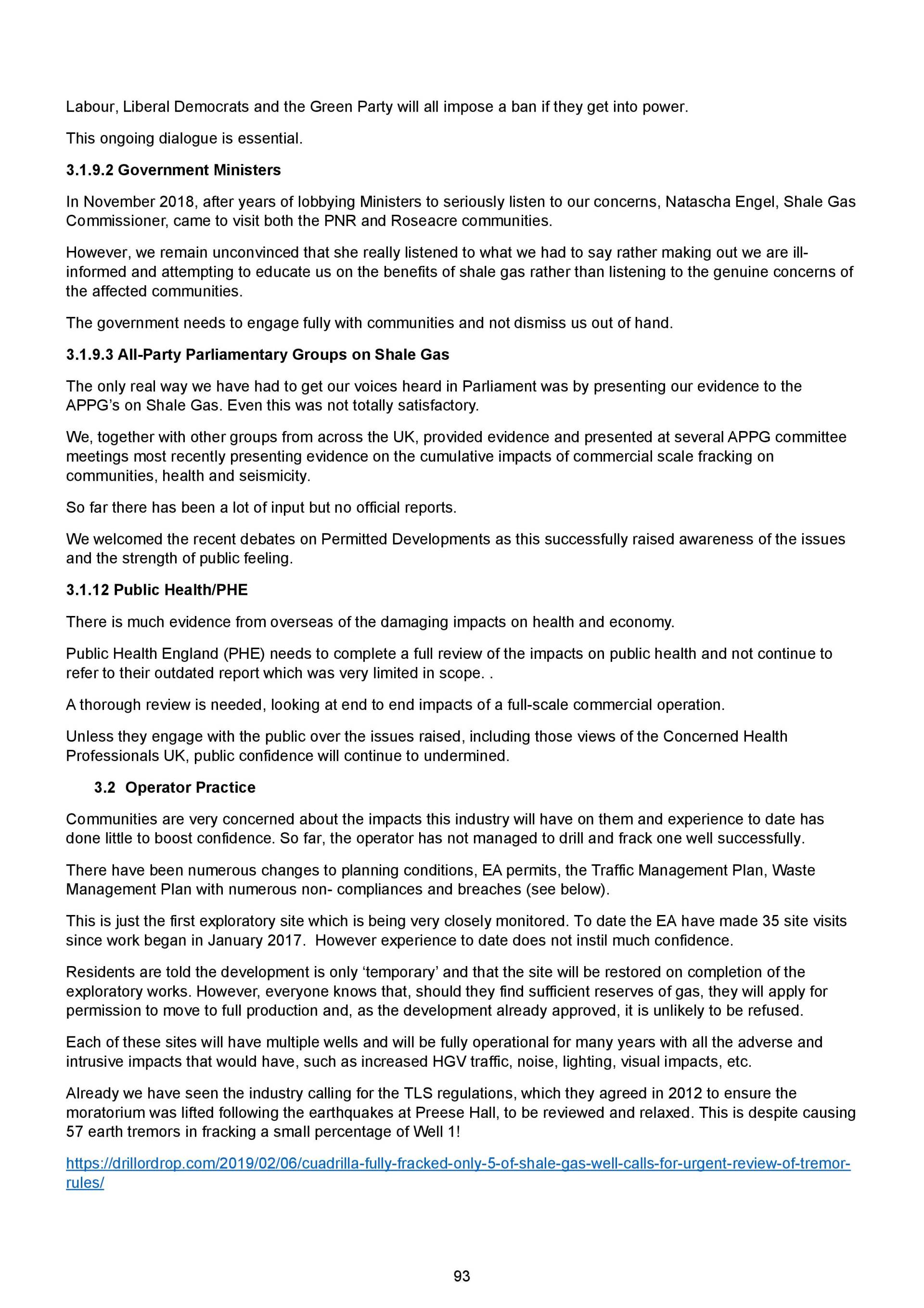If so, and drawing from experience, the protest and challenge will only increase as more areas are affected and climate change/plastics become even more mainstream, the costs and negative impacts will rise for communities, local economies and the public purse and the question of social licence, justice and democratic process, which does not come out in scientific harms, will become a dominant question/battle ground. In this compendium the opinions expressed by the authors and contributors have enabled us to provide a fully referenced compilation of evidence outlining the risks, impacts and potential harms of fracking.