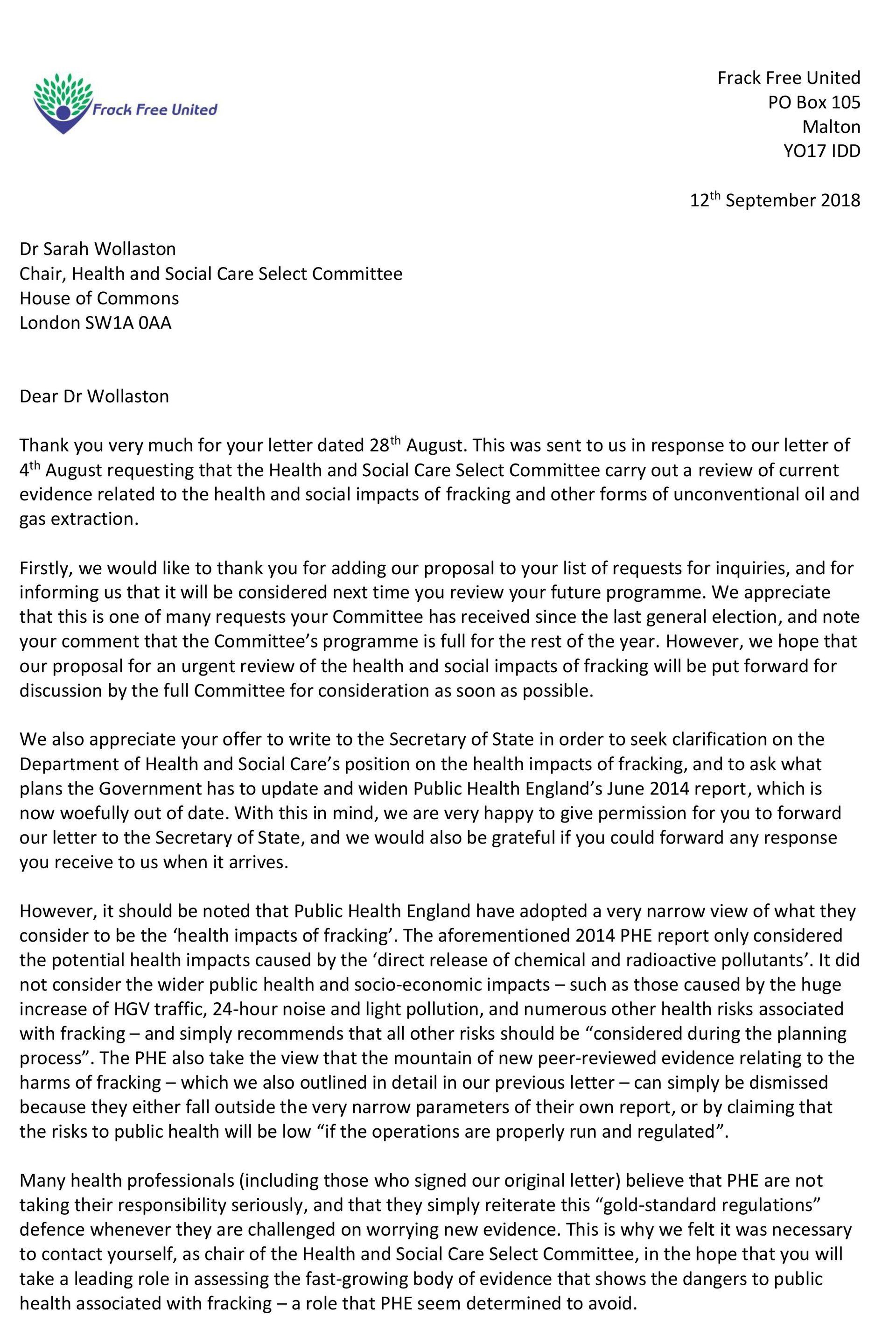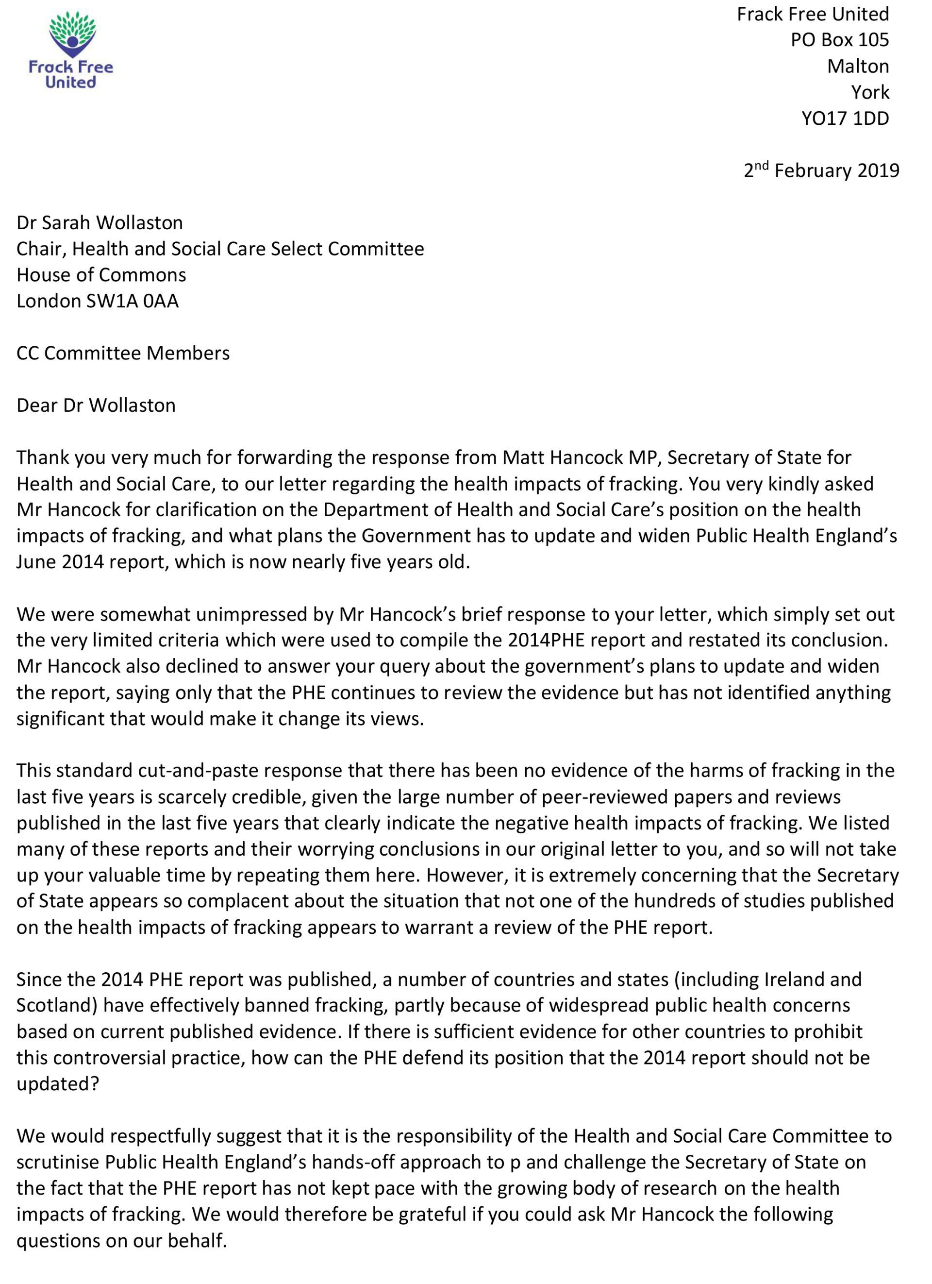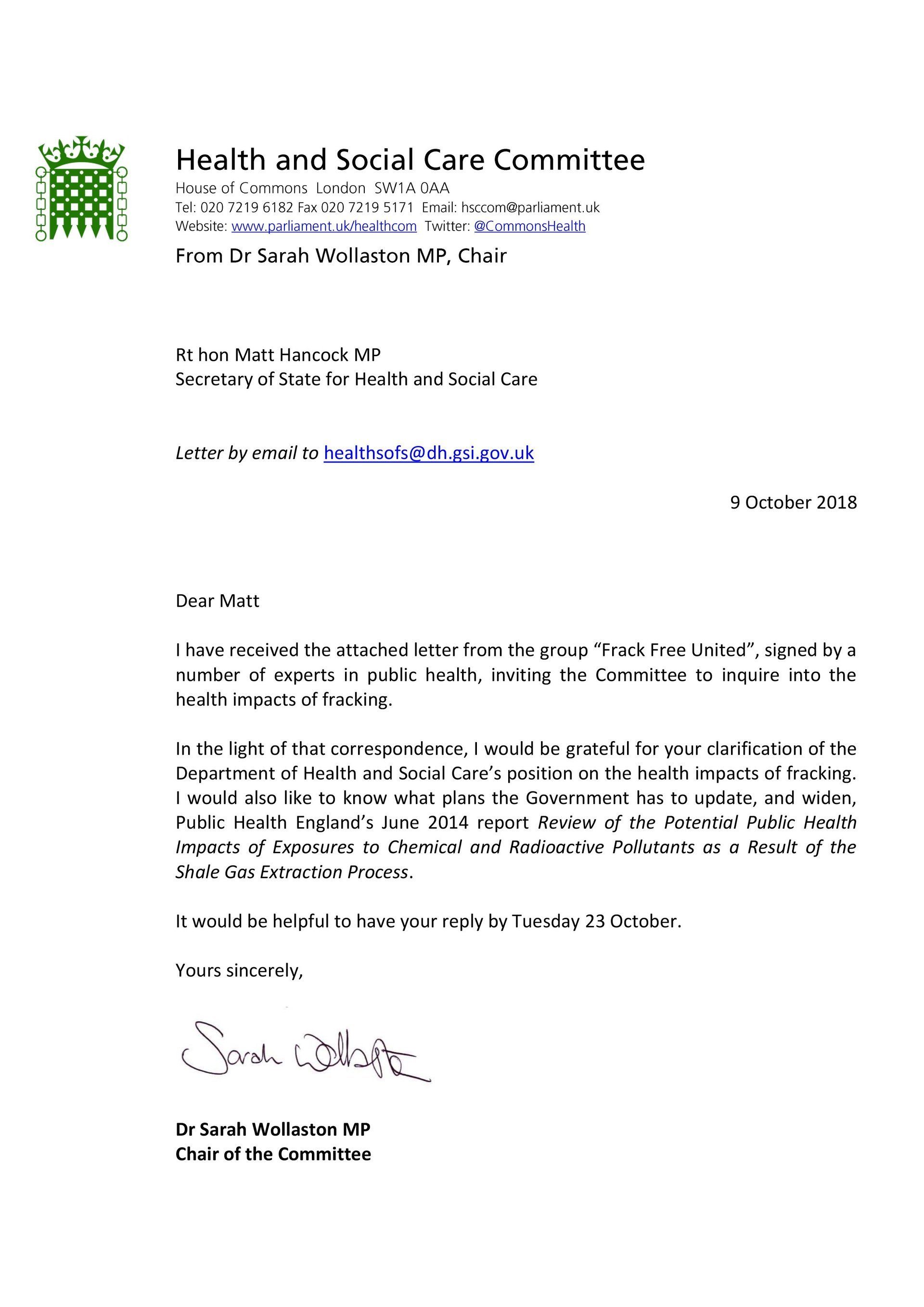 Frack Free United is currently in negotiations with the Health and Social care Select Committee. Dr Sarah Wollaston MP, has written to the Secretary of State for Health and Social Care.