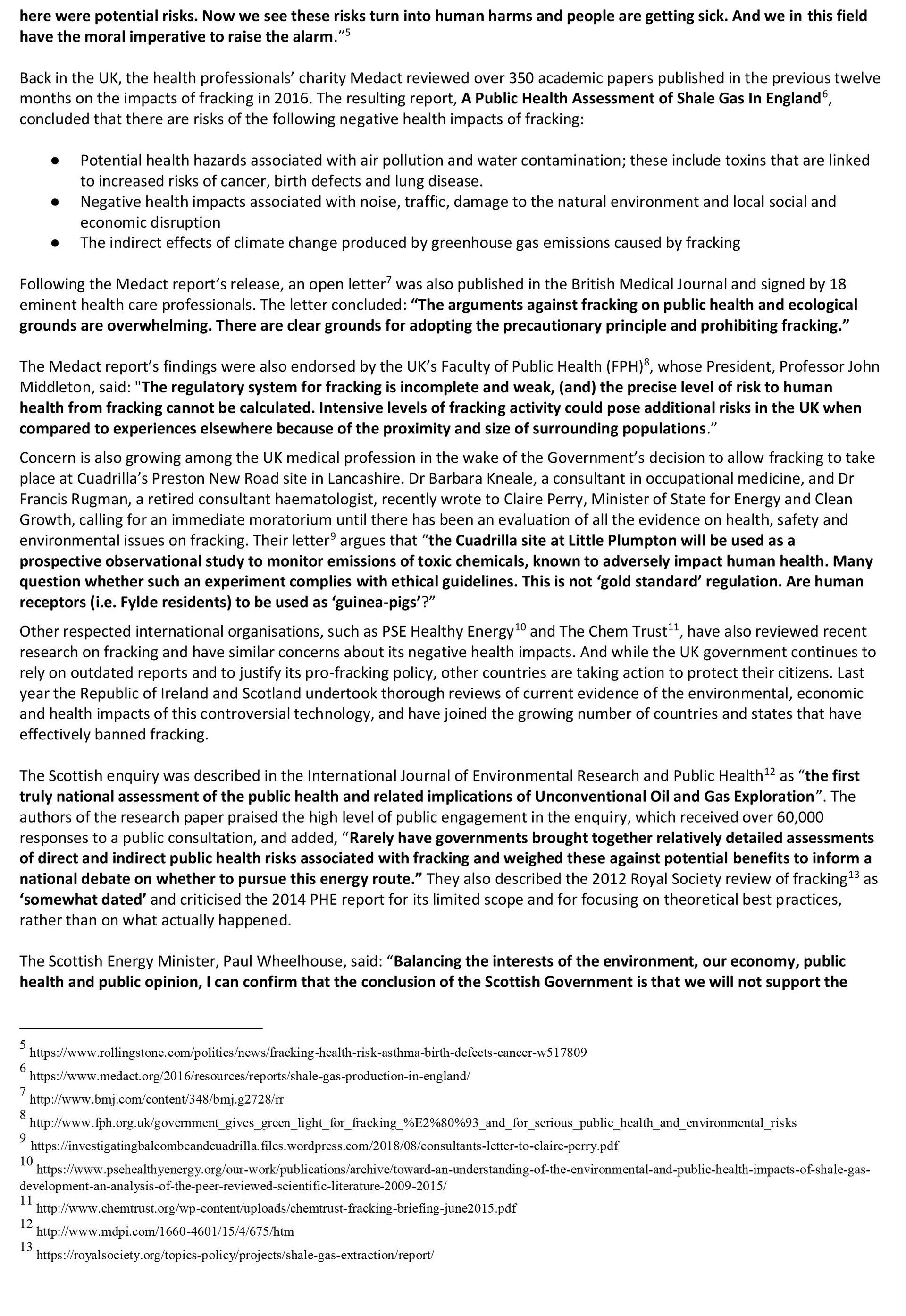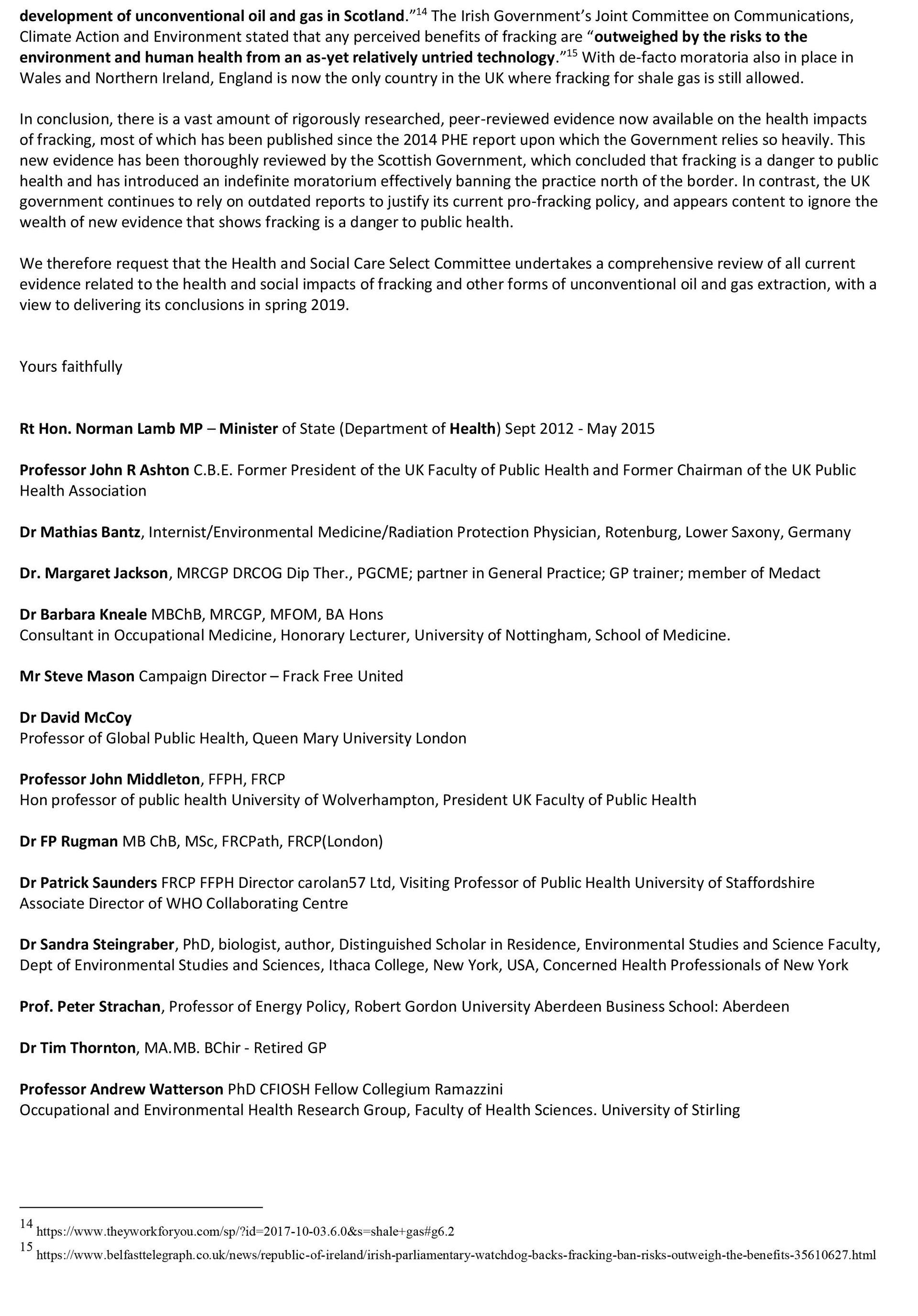 We would respectfully suggest that it is the responsibility of the Health and Social Care Committee to scrutinise Public Health England’s hands-off approach to p and challenge the Secretary of State on the fact that the PHE report has not kept pace with the growing body of research on the health impacts of fracking. We would therefore be grateful if you could ask Mr Hancock the following questions on our behalf.